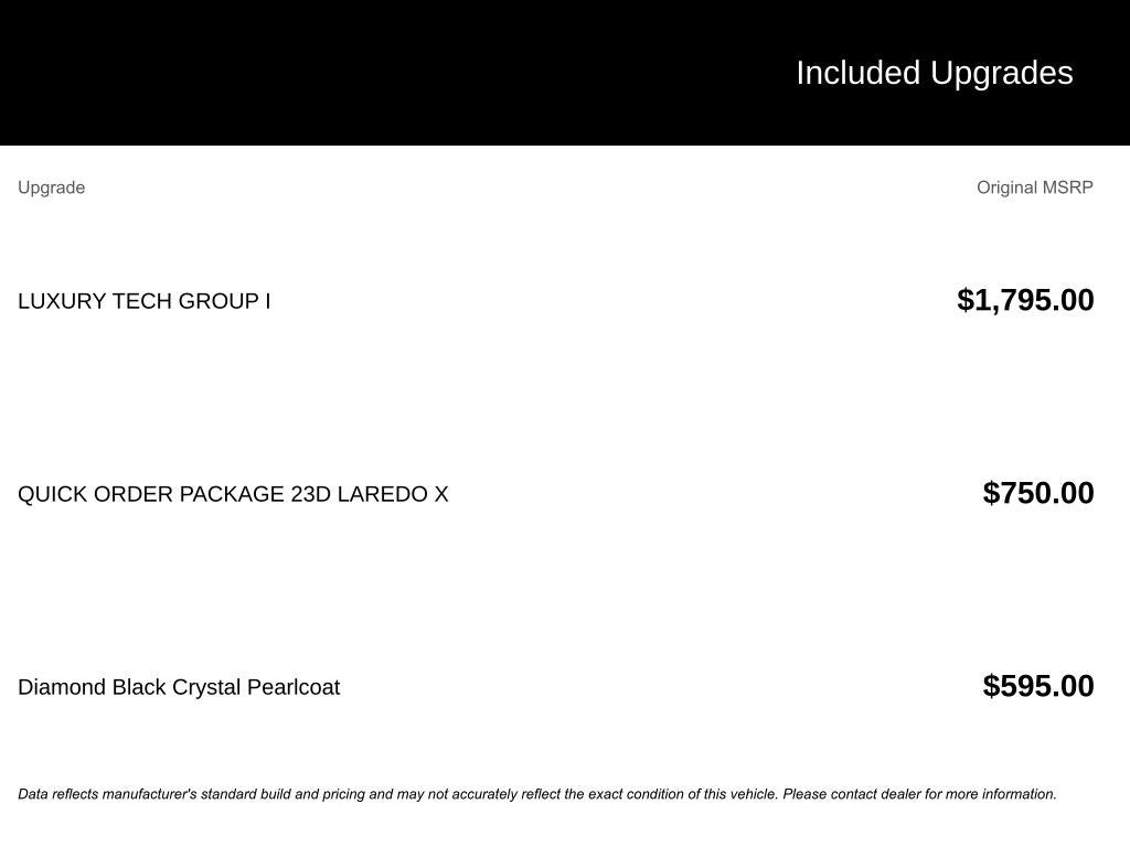 Luxury Tech Group I (115V Auxiliary Power Outlet, Heated Front Seats, Heated Steering Wheel, Power Liftgate, Rain Sensitive Windshield Wipers, Remote Start System, Satellite Radio, Selectable Tire Fill Alert, and Wireless Charging Pad), Quick Order Package 23D Laredo X (Laredo X, Power Sunroof, and Wheels: 18 x 8 Fully Painted Aluminum), 4-Wheel Disc Brakes, 6 Speakers, ABS brakes, Air Conditioning, Alloy wheels, AM/FM radio: SiriusXM, Anti-whiplash front head restraints, Automatic temperature control, Brake assist, Bumpers: body-color, Cloth Seats, Compass, Delay-off headlights, Driver door bin, Driver vanity mirror, Dual front impact airbags, Dual front side impact airbags, Electronic Stability Control, Emergency communication system, Four wheel independent suspension, Front anti-roll bar, Front Bucket Seats, Front Center Armrest w/Storage, Front dual zone A/C, Front License Plate Bracket, Front reading lights, Fully automatic headlights, Heated door mirrors, Illuminated entry, Knee airbag, Low tire pressure warning, Model Year Tracking, Normal Duty Suspension, Occupant sensing airbag, Outside temperature display, Overhead airbag, Overhead console, Panic alarm, ParkView Rear Back-Up Camera, Passenger door bin, Passenger vanity mirror, Power door mirrors, Power driver seat, Power steering, Power windows, Radio data system, Radio: Uconnect 5 with 8.4 Display, Rear anti-roll bar, Rear reading lights, Rear window defroster, Rear window wiper, Remote keyless entry, Security system, Speed control, Speed-Sensitive Wipers, Split folding rear seat, Spoiler, Steering wheel mounted audio controls, Tachometer, Telescoping steering wheel, Tilt steering wheel, Traction control, Trip computer, Variably intermittent wipers, Voltmeter, and Wheels: 17 x 6.5 Fully Painted Aluminum. Price includes: $2250 - 2025 National Retail Bonus Cash . Exp. 03/02/2026