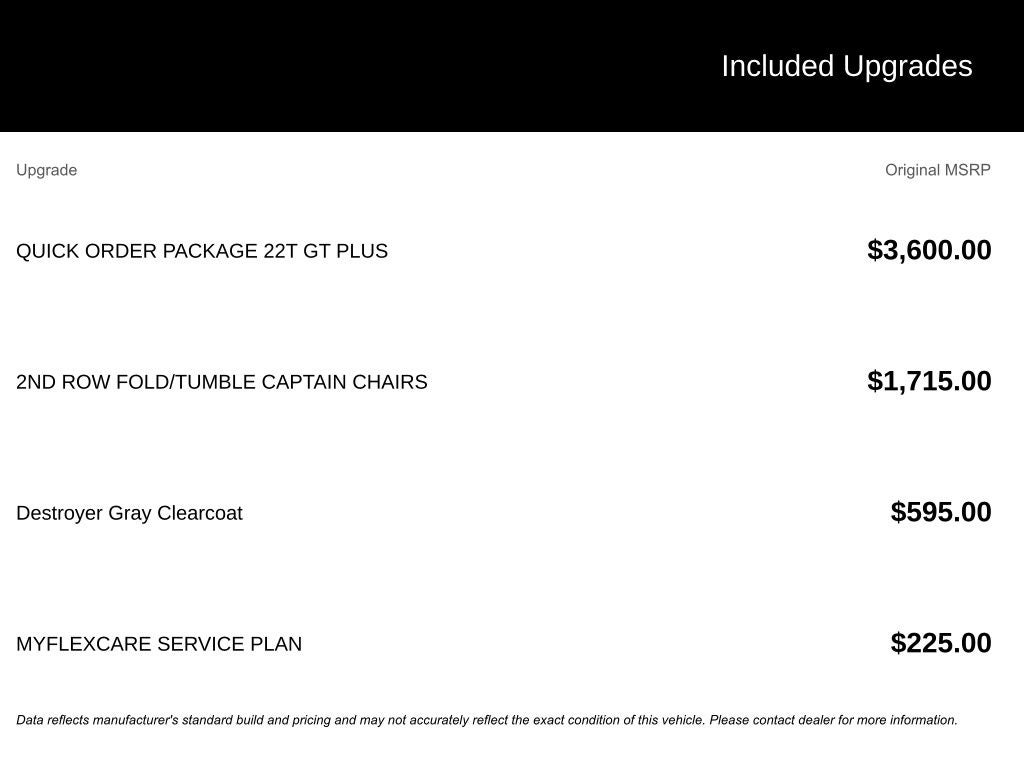 Quick Order Package 22T GT Plus (115V Auxiliary Power Outlet, 7 and 4 Pin Wiring Harness, Adaptive Cruise Control with Stop, Auto High Beam Headlamp Control, Auto-Dimming Exterior Driver Mirror, Black Roof Rails, Blind Spot with Trailer Detection, Class IV Receiver Hitch, Dual Remote USB Port - Charge Only, Exterior Mirrors with Heating Element, Exterior Mirrors with Memory, Exterior Mirrors with Supplemental Signals, Floor Console with Leather Armrest, Full Speed Forward Collision Warning Plus, Gloss Black Exterior Mirrors, Heated Second Row Seats, Integrated Roof Rail Crossbars, Leather Trimmed Bucket Seats, Leather Wrapped Door Panels, LED Auxiliary Low Beam and Turn Signal, Power 6x9 Multi-Function Foldaway Mirrors, Power 8-Way Driver Memory 8-Way Passenger Seats, Power Driver/Passenger 4-Way Lumbar Adjust, Power Sunroof, Power Tilt and Telescopic Steering Column, Radio/Driver Seat/Mirrors Memory, Red Accent Stitching, Trailer Brake Control, and Ventilated Front Seats), AWD, 2nd Row Fold/Tumble Captain Chairs, 2nd Row Mini Console with Cupholders, 2nd Row Seat Mounted Inboard Armrests, 3.09 Rear Axle Ratio, 3rd Row Floor Mat and Mini Console, 3rd row seats: split-bench, 4-Wheel Disc Brakes, 6-Passenger Seating, 9 Speakers, ABS brakes, Air Conditioning, Alloy wheels, AM/FM radio: SiriusXM w/360L, Apple CarPlay/Android Auto, Auto-dimming Rear-View mirror, Auto-leveling suspension, Automatic temperature control, Brake assist, Bumpers: body-color, Cloth Bucket Seats with Shift Insert, Compass, Delay-off headlights, Driver door bin, Driver vanity mirror, Dual front impact airbags, Dual front side impact airbags, Electronic Stability Control, Emergency communication system: Dodge Connect, Four wheel independent suspension, Front anti-roll bar, Front Bucket Seats, Front Center Armrest w/Storage, Front dual zone A/C, Front License Plate Bracket, Front reading lights, Fully automatic headlights, Garage door transmitter, Heated door mirrors, Heated front seats, Heated steering wheel, Illuminated entry, Knee airbag, Leather steering wheel, Low tire pressure warning, MyFlexCare Service Plan, Navigation System, Occupant sensing airbag, Outside temperature display, Overhead airbag, Overhead console, Panic alarm, ParkView Rear Back-Up Camera, Passenger door bin, Passenger vanity mirror, Power door mirrors, Power driver seat, Power Liftgate, Power steering, Power windows, Radio data system, Radio: Uconnect 5 Nav with 10.1 Display, Rain sensing wipers, Rear air conditioning, Rear anti-roll bar, Rear Load Leveling Suspension, Rear reading lights, Rear seat center armrest, Rear window defroster, Rear window wiper, Remote keyless entry, Security system, Speed control, Speed-sensing steering, Speed-Sensitive Wipers, Split folding rear seat, Spoiler, Sport steering wheel, Steering wheel mounted audio controls, Tachometer, Telescoping steering wheel, Tilt steering wheel, Traction control, Trip computer, Variably intermittent wipers, Voltmeter, and Wheels: 20 x 8 Satin Carbon Split 5-Spoke.