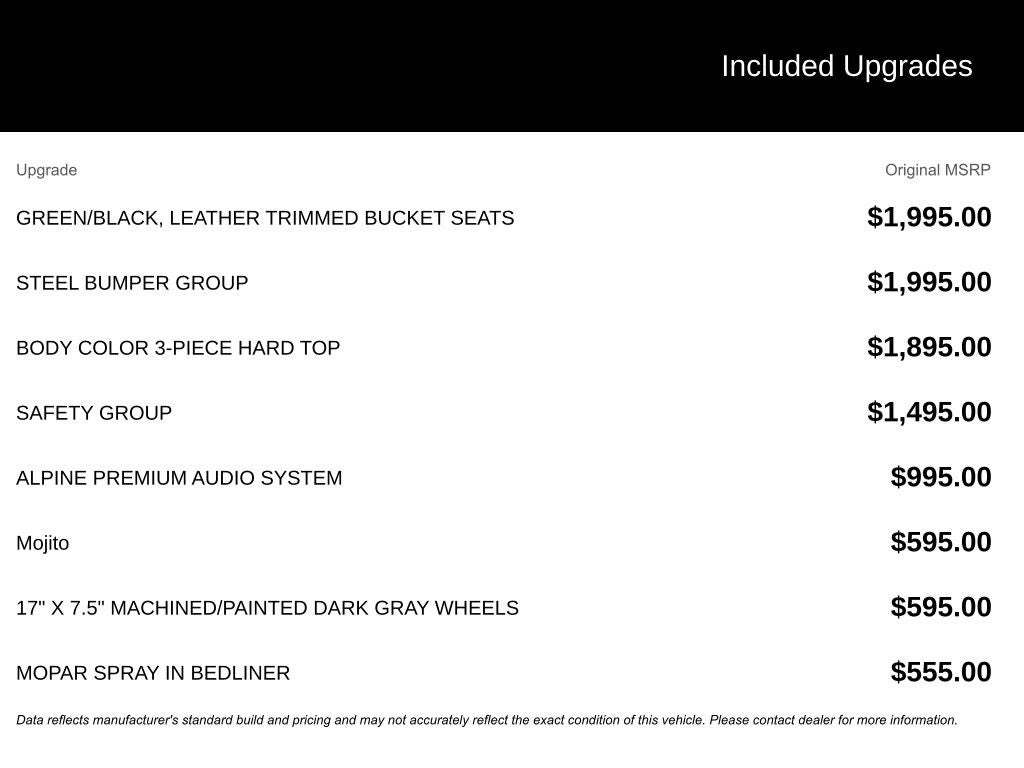 Convenience Group (Heated Front Seats, Heated Steering Wheel, Remote Start System, and Universal Garage Door Opener), Quick Order Package 24D Mojave, Safety Group (Auto High Beam Headlamp Control, Blind Spot and Cross Path Detection, and ParkSense Rear Park Assist System), Steel Bumper Group (Steel Front Bumper and Steel Rear Bumper), 110 Mph Vehicle Max Speed Calibration, 12.3 Touchscreen Display, 4-Wheel Disc Brakes, 4.10 Rear Axle Ratio, 4G LTE Wi-Fi Hot Spot, 8 Speakers, ABS brakes, Air Conditioning, Alexa Built-in, Alloy wheels, Alpine Premium Audio System, AM/FM radio: SiriusXM with 360L, Apple CarPlay, Apple CarPlay/Android Auto, Automatic temperature control, Body Color 3-Piece Hard Top, Body Color Rubicon Highline Flare, Brake assist, Compass, Connectivity - US/Canada, Delay-off headlights, Driver door bin, Driver vanity mirror, Dual front impact airbags, Dual front side impact airbags, Electronic Stability Control, Emergency communication system: Jeep Connect, For Details, Visit DriveUconnect.com, Freedom Panel Storage Bag, Front anti-roll bar, Front Bucket Seats, Front Center Armrest w/Storage, Front dual zone A/C, Front fog lights, Front License Plate Bracket, Front reading lights, Fully automatic headlights, Google Android Auto, Heated door mirrors, Heavy Duty Suspension with Gas Shocks, Illuminated entry, Integrated Center Stack Radio, Integrated roll-over protection, Low tire pressure warning, Manufacturer's Statement of Origin, MOPAR Spray in Bedliner, MyFlexCare Service Plan, Occupant sensing airbag, Outside temperature display, Overhead airbag, Panic alarm, Passenger door bin, Passenger vanity mirror, Power door mirrors, Power steering, Power windows, Premium Cloth Seats with Sport Bolsters, Radio data system, Radio: Uconnect 5 with 12.3 Display, Rear anti-roll bar, Rear reading lights, Rear Sliding Window, Rear Window Defroster, Remote keyless entry, Security system, SiriusXM Radio Service, SiriusXM with 360L, Speed control, Split folding rear seat, Steering wheel mounted audio controls, Tachometer, Telescoping steering wheel, Tilt steering wheel, Traction control, Trip computer, USB Host Flip, Variably intermittent wipers, Voltmeter, Wheels: 17 x 7.5 Dark Gray Painted, and Wheels: 17 x 7.5 Machined/Painted Dark GraY. Price includes: $1000 - 2026 National Retail Bonus Cash . Exp. 03/31/2026