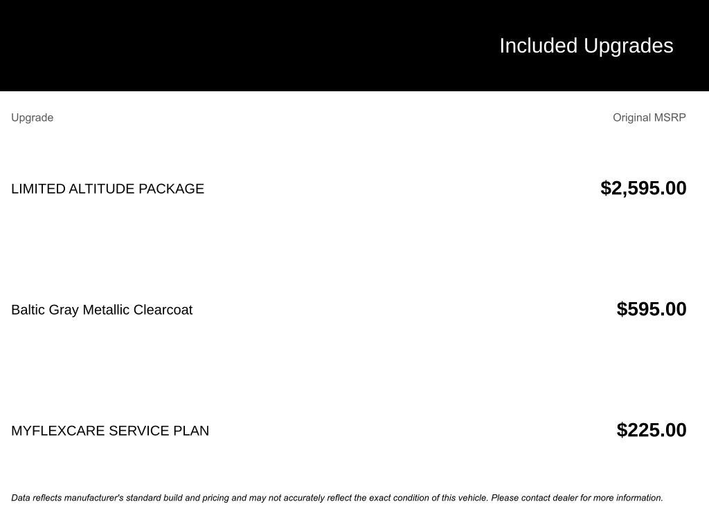 Limited Altitude Package (Delete Limited Badge, Dual-Pane Panoramic Sunroof, Exterior Accents Dark Neutral Metallic, and Wheels: 20 x 8.5 Gloss Black Painted Aluminum), Quick Order Package 2BE Limited, 10 Speakers, 3.70 Rear Axle Ratio, 4-Wheel Disc Brakes, 4G LTE Wi-Fi Hot Spot, ABS brakes, Active Noise Control System, Air Conditioning, Alloy wheels, AM/FM radio: SiriusXM with 360L, Anti-whiplash front head restraints, Apple CarPlay, AppLink/Apple CarPlay and Android Auto, Audio memory, Auto High-beam Headlights, Automatic temperature control, Auxiliary Battery, Brake assist, Bumpers: body-color, Capri Leatherette Seats, Compass, Connectivity - US/Canada, Delay-off headlights, Disassociated Touchscreen Display, Driver door bin, Driver vanity mirror, Dual front impact airbags, Dual front side impact airbags, Electronic Stability Control, Emergency communication system, For Details, Visit DriveUconnect.com, Four wheel independent suspension, Front anti-roll bar, Front Bucket Seats, Front Center Armrest w/Storage, Front dual zone A/C, Front fog lights, Front License Plate Bracket, Front reading lights, Fully automatic headlights, Garage door transmitter, Global Telematics Box Module (TBM), Gloss Black Exterior Mirrors, Google Android Auto, GPS Antenna Input, Heated door mirrors, Heated Exterior Mirrors, Heated front seats, Heated rear seats, Heated steering wheel, Illuminated entry, Integrated Center Stack Radio, Integrated Voice Command w/Bluetooth®, Knee airbag, Low tire pressure warning, Manual Folding Exterior Mirrors, Memory seat, MyFlexCare Service Plan, Navigation System, Normal Duty Suspension, Occupant sensing airbag, Outside temperature display, Overhead airbag, Overhead console, Panic alarm, ParkView Rear Back-Up Camera, Passenger door bin, Passenger vanity mirror, Power door mirrors, Power driver seat, Power Liftgate, Power passenger seat, Power steering, Power windows, Radio data system, Radio: Uconnect 5 Nav w/12.3 Display, Rear anti-roll bar, Rear reading lights, Rear window defroster, Rear window wiper, Remote keyless entry, Security system, Speed control, Speed-Sensitive Wipers, Split folding rear seat, Spoiler, Steering wheel mounted audio controls, Tachometer, Telescoping steering wheel, Tilt steering wheel, Traction control, Trip computer, Turn signal indicator mirrors, USB Host Flip, Variably intermittent wipers, Voltmeter, and Wheels: 18 x 8.0 Polished/Painted AluminuM.