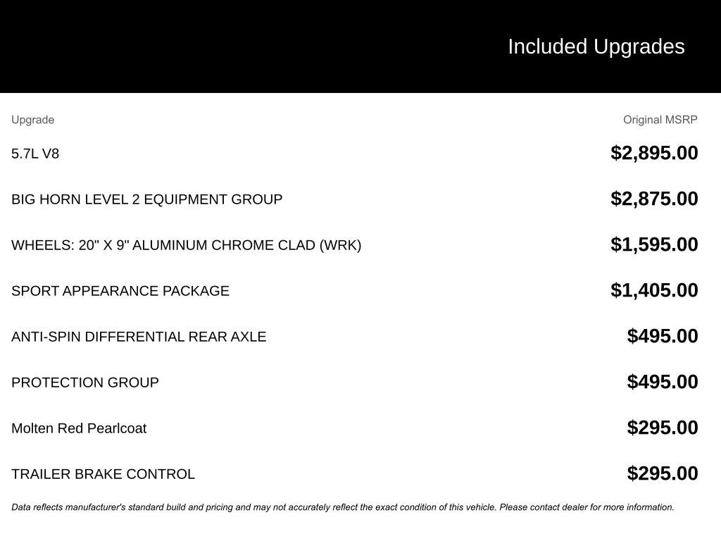 Big Horn Level 2 Equipment Group (115V Auxiliary Power Outlet, 115V Auxiliary Rear Power Outlet, 12 Touchscreen Display, 2nd Row in Floor Storage Bins, 3 Rear Seat Head Restraints, 4 Way Front Headrests, 400W Inverter, 4G LTE Wi-Fi Hot Spot, 9 Amplified Speakers with Subwoofer, Air Conditioning ATC with Dual Zone Control, Apple CarPlay, Auto Power-Folding Mirrors, Auto-Dimming Exterior Driver Mirror, Auto-Dimming Rear-View Mirror, Black Exterior Mirrors, Black Premium Power Mirrors, Body Color Fender Flares, Bucket Seats, Center Console Parts Module, Cluster 7.0 TFT Color Display, Configurable Drive Mode, Connected Travel and Traffic Services, Connectivity - US/Canada, Convex Wide-Angle Exterior Mirror Insert, Deluxe Cloth Bucket Seats, Disassociated Touchscreen Display, Exterior Mirrors Courtesy Lamps, Exterior Mirrors with Heating Element, Exterior Mirrors with Supplemental Signals, Front Seat Back Map Pockets, Full Length Floor Console, Global Telematics Box Module, Glove Box Lamp, Google Android Auto, GPS Antenna Input, GPS Navigation, HD Radio, Heated Front Seats, Heated Steering Wheel, Integrated Center Stack Radio, Integrated Voice Command with Bluetooth®, Leather Wrapped Steering Wheel, LED Dome Lamp with on/Off Switch, LED Footwell Lighting, Manual Adjust 4-Way Front Passenger Seat, Media Hub with 2 Charge Only USBs, Overhead LED Lamps, Power 2-Way Driver Lumbar Adjust, Power Adjust 8-Way Driver Seat, Power Adjustable Pedals, Premium Overhead Console, Radio: Uconnect 5 Navigation with 12.0 Display, Rear 60/40 Folding Seat, Rear Center Armrest, Rear Power Sliding Window, Rear Window Defroster, Remote Tailgate Release, Security Alarm, SiriusXM Radio Service, SiriusXM with 360L, Steering Wheel Mounted Audio Controls, Sun Visors with Illuminated Vanity Mirrors, Universal Garage Door Opener, and USB Host Flip), Protection Group (Tow Hooks), Quick Order Package 27Z Big Horn, Sport Appearance Package (Black Interior Accents, Body Color Door Handles, Body Color Front Bumper, Body Color Rear Bumper with Step Pads, Body Color Tailgate Handle, Grille Surround 1 Body Color Texture 1 Black, and RAM Grille Badge - Chrome), 4-Wheel Disc Brakes, 48V Belt Starter Generator, 6 Speakers, ABS brakes, Air Conditioning, Alloy wheels, AM/FM radio, Anti-Spin Differential Rear Axle, Apple CarPlay/Android Auto, Auto High-beam Headlights, Brake assist, Bumpers: chrome, Cloth Bucket Seats, Compass, Delay-off headlights, Driver door bin, Dual front impact airbags, Dual front side impact airbags, Electronic Stability Control, Front anti-roll bar, Front Bucket Seats, Front Center Armrest w/Storage, Front fog lights, Front License Plate Bracket, Front reading lights, Front wheel independent suspension, Fully automatic headlights, Heated door mirrors, Illuminated entry, Low tire pressure warning, Manual Adjust 4-Way Driver Seat, Manual Folding Exterior Mirrors, Manufacturer's Statement of Origin, MOPAR Front and Rear Rubber Floor Mats, MyFlexCare Service Plan, Occupant sensing airbag, Outside temperature display, Overhead airbag, Overhead console, Panic alarm, ParkView Rear Back-Up Camera, Passenger door bin, Passenger vanity mirror, Power door mirrors, Power steering, Power windows, Radio data system, Radio: Uconnect 5 W with 8.4 Display, Rear anti-roll bar, Rear step bumper, Rear Wheelhouse Liners, Remote keyless entry, Speed control, Supplier Part Tracking (J-1), Tachometer, Telescoping steering wheel, Tilt steering wheel, Traction control, Trailer Brake Control, Trip computer, Variably intermittent wipers, and Voltmeter. Price includes: $3500 - 2026 National Retail Consumer Cash . Exp. 03/31/2026 $750 - 2026 Southwest BC Retail Bonus Cash . Exp. 03/31/2026