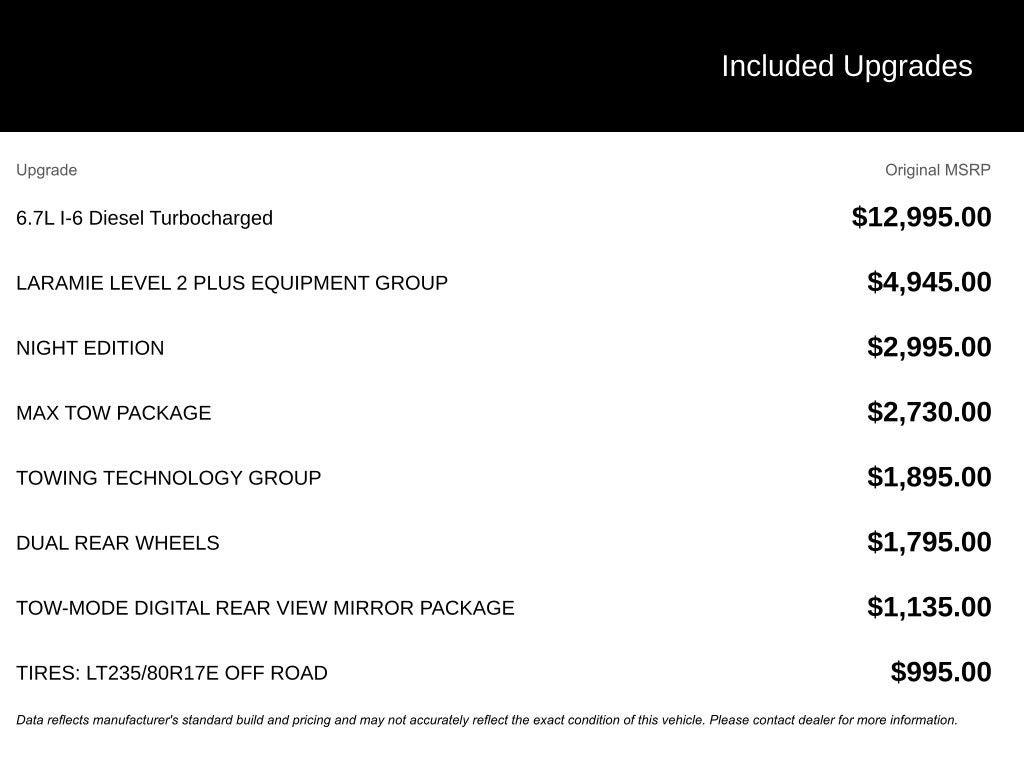 Laramie Level 2 Plus Equipment Group (#1 Seat Foam Cushion, 115V Auxiliary Rear Power Outlet, 14.4 Touchscreen Display, 17 Speaker Harman/Kardon Premium Sound, 2 Way Rear Headrest Seat, 2nd Row in Floor Storage Bins, 4 Way Front Headrests, 4G LTE Wi-Fi Hot Spot, Active Lane Management System, Adaptive Steering System, Alexa Built-in, Apple CarPlay, Auto Adjust in Reverse Exterior Mirrors, Auto Dimming Exterior Passenger Mirror, Auto High Beam Headlamp Control, Auto Power-Folding Mirrors, Auto-Dimming Exterior Mirrors, Bucket Seats, Center Stop Lamp with Cargo View Camera, Chrome Exterior Mirrors, Connected Travel and Traffic Services, Connectivity - US/Canada, Disassociated Touchscreen Display, Drowsy Driver Detection, Dual Wireless Charging Pad, Emergency Vehicle Alert System (EVAS), Exterior Mirrors Courtesy Lamps, Exterior Mirrors with Heating Element, Exterior Mirrors with Memory, Exterior Mirrors with Supplemental Signals, Foam Bottle Insert (door Trim Panel), Folding Flat Load Floor Storage, For Details Visit DriveUconnect.com, For More Info, Call 800-643-2112, Forward and Reverse Utility Lights, Front Seat Back Map Pockets, Full Length Upgraded Floor Console, Global Telematics Box Module, Google Android Auto, GPS Antenna Input, GPS Navigation, HD Radio, Heated Front Seats, Heated Steering Wheel, High Back Seats, Integrated Voice Command with Bluetooth®, Leather Trimmed Bucket Seats, LED Bed Lighting, Mirror Running Lights, MOPAR Deployable Bed Step, MOPAR Spray in Bedliner, Off-Road Information Pages, Power 2-Way Driver Lumbar Adjust, Power 2-Way Passenger Lumbar Adjust, Power Adjust 8-Way Driver Seat, Power Adjust 8-Way Front Passenger Seat, Power Adjust Mirrors, Power Adjustable Pedals with Memory, Power Deployable Running Boards, Power Heat Fold Memory Telescopic Mirrors, Power Telescoping Mirrors, Power-Adjustable Convex Aux Mirrors, Radio: Uconnect 5 Nav with 14.4 Display, Radio/Driver Seat/Mirrors/Pedals Memory, Rain Sensitive Windshield Wipers, Rear 60/40 Folding Seat, Remote Tailgate Release, Selectable Tire Fill Alert, SiriusXM Radio Service, SiriusXM with 360L, Traffic Sign Recognition, Trailer Tow Pages, and Ventilated Front Seats), Max Tow Package (5th Wheel/Gooseneck Towing Prep Group and Auto Level Rear Air Suspension), Night Edition (Black Exterior Mirrors, Black Exterior Truck Badging, Black Wheel Center Hub, Body Color Grille Surround, Gloss Black Grille Billets/Accents, and Sport Performance Hood), Quick Order Package 24H Laramie, Tow-Mode Digital Rear View Mirror Package (Digital Rearview Mirror and Tow-Mode Camera (Wired)), Towing Technology Group (MOPAR Trailer Camera Wiring with No Camera, Surround View Camera System, Trailer Reverse Guidance, and Trailer Tire Pressure Monitoring System), 10 Speakers, 4-Wheel Disc Brakes, 50 Gallon Fuel Tank, 6000# Front Axle with Hub Extension, ABS brakes, Air Conditioning, Alloy wheels, AM/FM radio: SiriusXM with 360L, Apple CarPlay/Android Auto, Auto-dimming Rear-View mirror, Automatic temperature control, Box and Rear Fender Clearance Lamps, Brake assist, Bumpers: body-color, Center Hub, Clearance Lamps, Compass, Delay-off headlights, Driver door bin, Driver vanity mirror, Dual front impact airbags, Dual front side impact airbags, Dual Rear Wheels, Electronic Stability Control, Engine Block Heater, Front anti-roll bar, Front Center Armrest w/Storage, Front dual zone A/C, Front fog lights, Front License Plate Bracket, Front reading lights, Fully automatic headlights, Garage door transmitter, Heated door mirrors, Heated front seats, Heated steering wheel, Illuminated entry, Leather Trim 40/20/40 Bench Seat, Low tire pressure warning, Manufacturer's Statement of Origin, MOPAR Front and Rear Rubber Floor Mats, MyFlexCare Service Diesel, Navigation System, Nexen Brand Tires, Occupant sensing airbag, Outside temperature display, O Price includes: $1000 - 2026 National Bonus Cash . Exp. 03/3