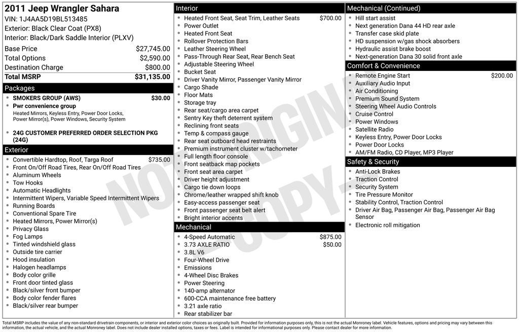 Quick Order Package 24G, Smoker's Group (Cigar Lighter and Removable Ash Tray), 18 x 7.5 Painted Aluminum Wheels, 4-Wheel Disc Brakes, 7 Speakers, ABS brakes, Air Conditioning, Alloy wheels, AM/FM radio: SIRIUS, Audio Jack Input for Mobile Devices, Black Easy Folding Soft Top, Brake assist, CD player, Cloth Bucket Seats, Compass, Driver door bin, Driver vanity mirror, Dual front impact airbags, Electronic Stability Control, Front anti-roll bar, Front Bucket Seats, Front Center Armrest w/Storage, Front fog lights, Fully automatic headlights, Heated door mirrors, Heated Front Seats, Heavy Duty Suspension w/Gas Shocks, Illuminated entry, Integrated roll-over protection, Leather steering wheel, Low tire pressure warning, Occupant sensing airbag, Outside temperature display, Panic alarm, Passenger door bin, Passenger vanity mirror, Power door mirrors, Power steering, Power windows, Radio data system, Radio: Media Center 130 CD/MP3, Rear anti-roll bar, Remote keyless entry, Remote Start System, Security system, Speed control, Steering wheel mounted audio controls, Tachometer, Tilt steering wheel, Traction control, Trip computer, and Variably intermittent wipers.