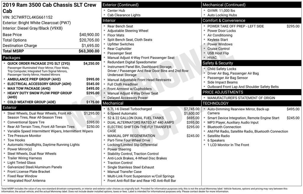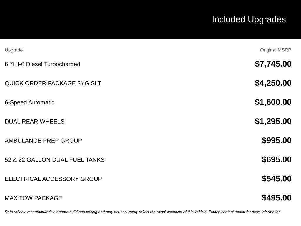 Ambulance Prep Group (220 Amp Alternator, Rear A/C Heater Prep Group, and Voltage Monitoring Auto Idle Up System), Cold Weather Group (Engine Block Heater and Winter Front Grille Cover), Electrical Accessory Group, Heavy Duty Snow Plow Prep Group, Max Tow Package (12.0 Dual Wheel Rear Axle and Add 4.10 Axle Ratio), Power Take Off Prep - Left Side (Hard Wired Remote Start), Quick Order Package 2YG SLT (1-Year SiriusXM Radio Service, 2 Way Rear Headrest Seat, 4 Way Front Headrests, 40/20/40 Split Bench Seat, 5.0 Touchscreen Display, Acoustic Front Door Glass, Black Exterior Mirrors, Body Color/Chrome Door Handles, Bright Front Bumper, Center Hub, Chrome Grille Surround, Cloth 40/20/40 Bench Seat, Door Sill Scuff Pads, Exterior Mirrors Courtesy Lamps, Exterior Mirrors w/Heating Element, Exterior Mirrors w/Supplemental Signals, Floor Covering Carpet, For More Info, Call 800-643-2112, Front Armrest w/Cupholders, Gloss Black Billets w/Chrome Grille, Glove Box, GPS Antenna Input, Halogen Quad Headlamps, Integrated Voice Command w/Bluetooth®, Manual Adjust 4-Way Driver Seat, Manual Adjust 4-Way Front Passenger Seat, Map/Courtesy Lamp, Mirror Running Lights, Overhead Console, Overhead Cupholder Lamp, Passenger Sun Visor w/Illuminated Mirror, Premium Vinyl Door Trim w/Map Pocket, Radio: Uconnect 3 w/5 Display, Rear Dome Lamp, Rear Folding Seat, SiriusXM Satellite Radio, SLT Badge, Temperature & Compass Gauge, Tinted Acoustic Windshield Glass, Tire Pressure Information System, Trailer Tow Mirrors, Traveler/Mini Trip Computer, and Wheels: 18 x 8 Steel Chrome Clad), 102 mph Maximum Speed, 11.50 Dual Wheels Rear Axle, 205mm HD Front Axle, 4-Wheel Disc Brakes, 4.10 Axle Ratio, 52 & 22 Gallon Dual Fuel Tanks, 6 Speakers, ABS brakes, Add Black Vinyl Floor Covering, Air Conditioning, AM/FM radio, Bright Wheel Skins, Bulb Out Detection Defeat for LED, Center Stack Storage Drawer, Delay-off headlights, Driver door bin, Dual Alternators Rated At 440 Amps, Dual front impact airbags, Dual Rear Wheels, Electric Shift-On-The-Fly Transfer Case, Electronic Stability Control, Front anti-roll bar, Front Center Armrest w/Storage, Fully automatic headlights, HD Vinyl 40/20/40 Split Bench Seat, Heated door mirrors, Manual DPF Regeneration, Manufacturer's Statement of Origin, Occupant sensing airbag, Overhead console, ParkView Rear Back-Up Camera, Passenger door bin, Passenger vanity mirror, Power door mirrors, Power steering, Power windows, Radio data system, Radio: Uconnect 3.0, Rear anti-roll bar, Rear View Auto Dim Mirror w/Display, Remote Start System, Speed control, Tachometer, Tilt steering wheel, Traction control, Trailer Brake Control, Turn signal indicator mirrors, USB Host Flip, Variably intermittent wipers, Voltmeter, Wheels: 17 x 6 Steel Chrome Clad, and Wheels: 18 x 8 Steel.