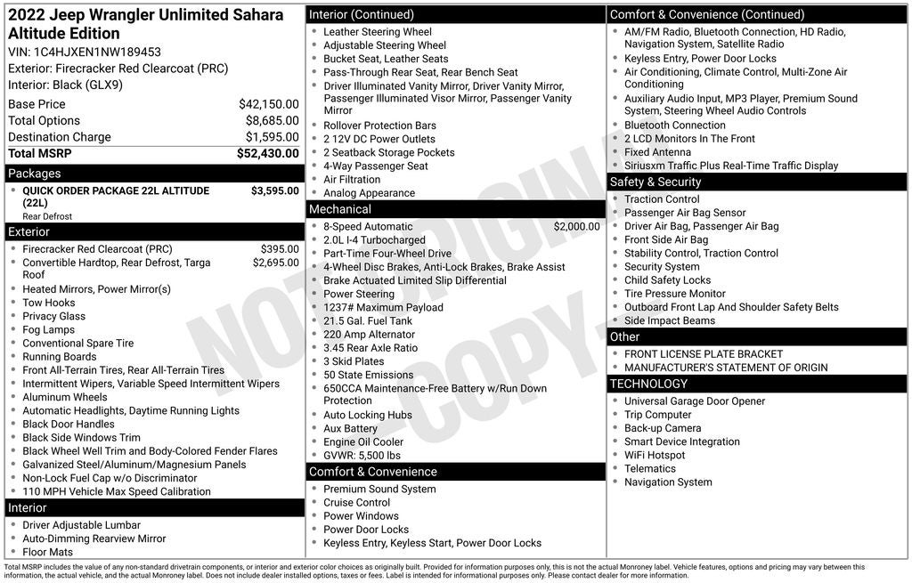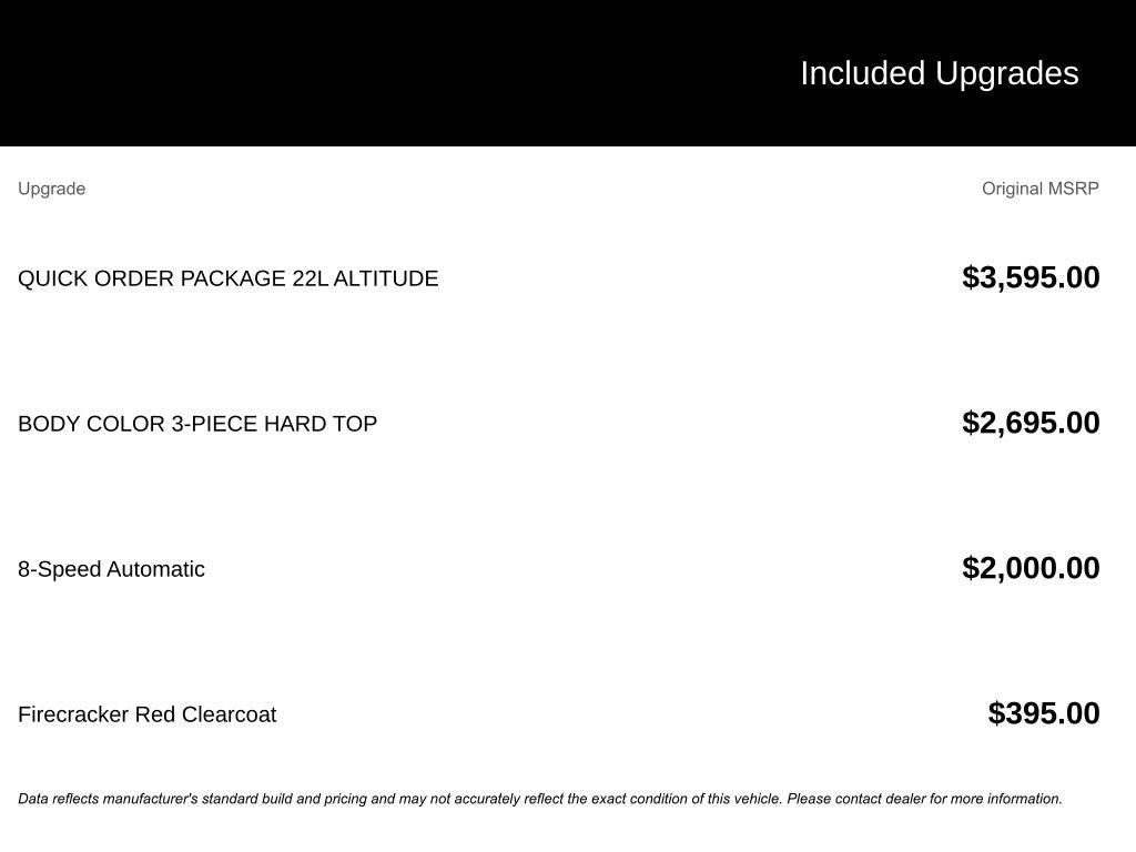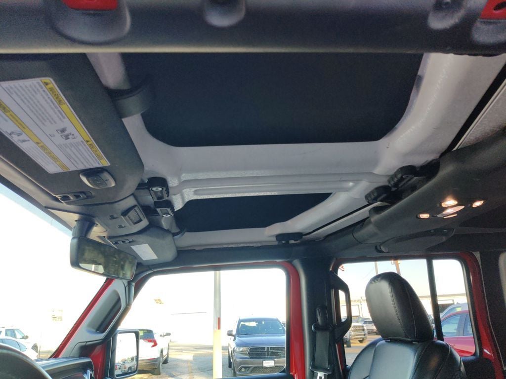 Altitude Package, Quick Order Package 22L Altitude (110 MPH Vehicle Max Speed Calibration, Black Interior Accents, Black Trail Rated Badge, Body Color 3-Piece Hard Top, Body Color Grille w/Gloss Black Rings, Bridgestone Brand Tires, Freedom Panel Storage Bag, Leather Trimmed Bucket Seats w/2L, Leather Wrapped Park Brake Handle, Leather Wrapped Shift Knob, Matte Black Jeep Badge, Mold In Color Bumper w/Gloss Black, MOPAR Hardtop Headliner, No Soft Top, Rear Window Defroster, Rear Window Wiper/Washer, Wheels: 18 x 7.5 Gloss Black Aluminum, and Wizard Black Instrument Panel Bezels), 3.45 Rear Axle Ratio, 4-Wheel Disc Brakes, 9 Speakers, ABS brakes, Air Conditioning, Alloy wheels, AM/FM radio: SiriusXM, Apple CarPlay/Android Auto, Auto-dimming Rear-View mirror, Automatic temperature control, Aux Battery, Brake assist, Cloth Low-Back Bucket Seats, Compass, Delay-off headlights, Driver door bin, Driver vanity mirror, Dual front impact airbags, Dual front side impact airbags, Electronic Stability Control, Emergency communication system: SiriusXM Guardian, Engine Oil Cooler, Front anti-roll bar, Front Bucket Seats, Front Center Armrest w/Storage, Front dual zone A/C, Front fog lights, Front License Plate Bracket, Front reading lights, Fully automatic headlights, Garage door transmitter, Heated door mirrors, Heavy Duty Suspension w/Gas Shocks, Illuminated entry, Integrated roll-over protection, Leather steering wheel, Low tire pressure warning, Manufacturer's Statement of Origin, Navigation System, Non-Lock Fuel Cap w/o Discriminator, Occupant sensing airbag, Outside temperature display, Panic alarm, ParkView Rear Back-Up Camera, Passenger door bin, Passenger vanity mirror, Power door mirrors, Power steering, Power windows, Radio data system, Radio: Uconnect 4C Nav w/8.4 Display, Rear anti-roll bar, Rear reading lights, Remote keyless entry, Security system, Speed control, Split folding rear seat, Steering wheel mounted audio controls, Stop-Start Dual Battery System, Tachometer, Telescoping steering wheel, Tilt steering wheel, Traction control, Trip computer, Variably intermittent wipers, Voltmeter, and Wheels: 18 x 7.5 Polished w/Gray Spokes.
