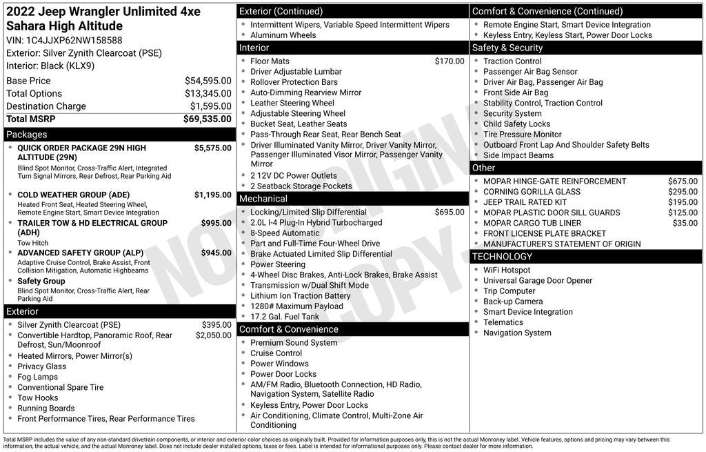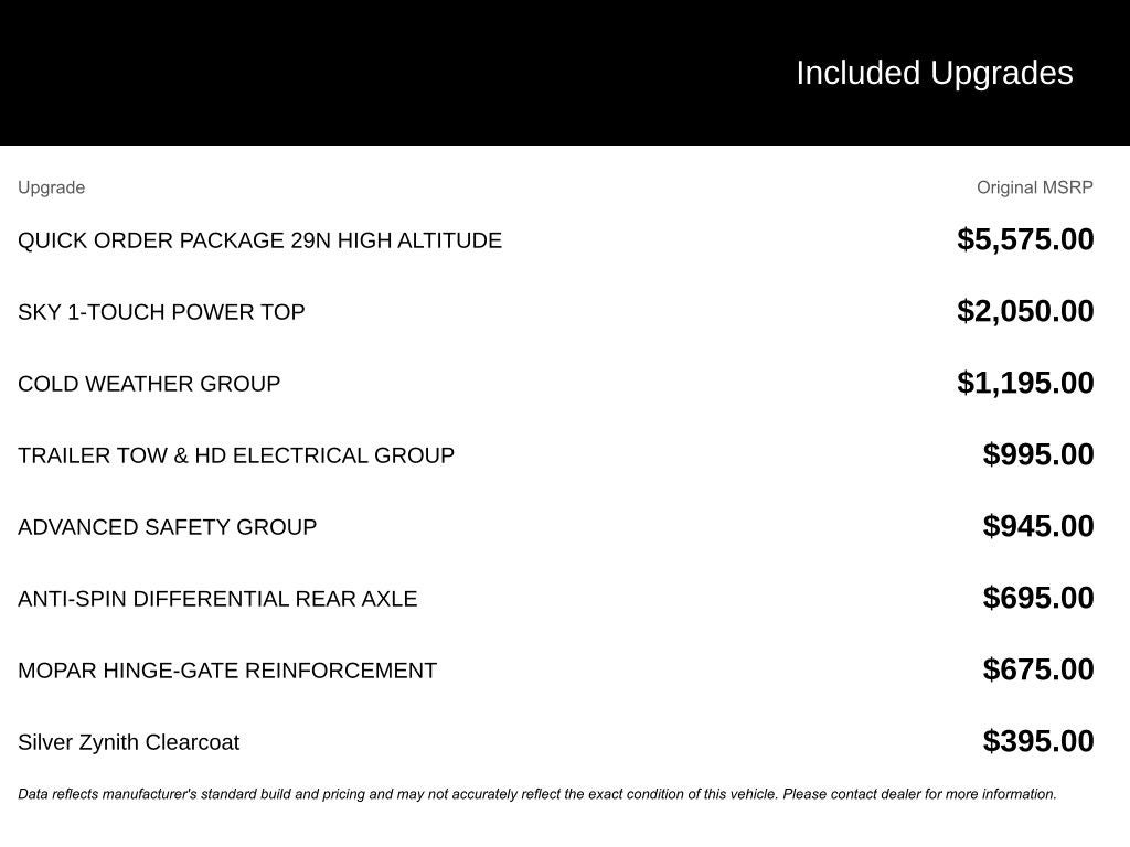 Advanced Safety Group (Adaptive Cruise Control w/Stop, Advanced Brake Assist, Auto High Beam Headlamp Control, and Full Speed Forward Collision Warning Plus), Cold Weather Group (Heated Front Seats, Heated Steering Wheel, and Remote Start System), High Altitude Package, Quick Order Package 29N High Altitude (Body Color 3-Piece Hard Top, Body Color Door Handles, Body Color Front Bumper, Body Color Grille w/Gloss Black Rings, Body Color Power Locking Fuel Filler Door, Body Color Rear Bumper w/Step Pads, Exterior Mirrors w/Supplemental Signals, Freedom Panel Storage Bag, Leather Trimmed Bucket Seats, Premium Dark Exterior Accents, Rear Window Defroster, Rear Window Wiper/Washer, Summit Badging, Wheels: 20 x 8.0 Fully Painted Aluminum, and Wrapped I/P Bezel w/Caramel Stitch), Safety Group (Blind Spot & Cross Path Detection and ParkSense Rear Park Assist System), Trailer Tow & HD Electrical Group (7 & 4 Pin Wiring Harness, 700 Amp Maintenance Free Battery, Auxiliary Switches, and Class II Receiver Hitch), 2.0L I4 DOHC, 3.73 Rear Axle Ratio, 4-Wheel Disc Brakes, 9 Speakers, ABS brakes, Air Conditioning, Alloy wheels, AM/FM radio, Anti-Spin Differential Rear Axle, Apple CarPlay/Android Auto, Auto-dimming Rear-View mirror, Automatic temperature control, Brake assist, Compass, Corning Gorilla Glass, Delay-off headlights, Driver door bin, Driver vanity mirror, Dual front impact airbags, Dual front side impact airbags, Electronic Stability Control, Emergency communication system: SiriusXM Guardian, Front anti-roll bar, Front Bucket Seats, Front Center Armrest w/Storage, Front dual zone A/C, Front fog lights, Front License Plate Bracket, Front reading lights, Fully automatic headlights, Garage door transmitter, Heated door mirrors, Illuminated entry, Integrated roll-over protection, Jeep Trail Rated Kit, Leather Shift Knob, Leather steering wheel, Low tire pressure warning, Manufacturer's Statement of Origin, MOPAR All-Weather Floor Mats, MOPAR Cargo Tub Liner, MOPAR Hinge-Gate Reinforcement, MOPAR Plastic Door Sill Guards, Navigation System, Occupant sensing airbag, Outside temperature display, Panic alarm, ParkView Rear Back-Up Camera, Passenger door bin, Passenger vanity mirror, Power door mirrors, Power steering, Power Top Quarter Window Storage Bag, Power windows, Premium McKinley Trimmed Seats, Radio data system, Radio: Uconnect 4C Nav w/8.4 Display, Rear anti-roll bar, Rear reading lights, Rear seat center armrest, Remote keyless entry, Removable Rear Quarter Windows, Security system, Sky 1-Touch Power Top, Speed control, Split folding rear seat, Sport Suspension, Steering wheel mounted audio controls, Tachometer, Telescoping steering wheel, Tilt steering wheel, Traction control, Trip computer, Variably intermittent wipers, Voltmeter, and Wheels: 20 x 8 Fully Painted Aluminum.