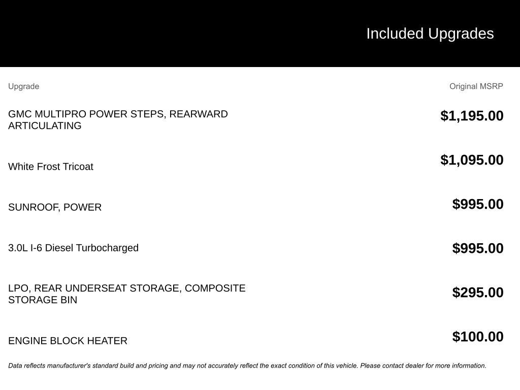 Preferred Equipment Group 5SA (120-Volt Bed Mounted Power Outlet, 120-Volt Instrument Panel Power Outlet, 170 Amp Alternator, 2 Charge/Data USB Ports Inside Center Console, 2 Type-C Charge-Only Rear USB Ports, 2 USB Ports, Auto-Locking Rear Differential, Auxiliary External Transmission Oil Cooler, Bed View Camera, Chrome Header w/Signature Denali Chrome Grille, Chrome Recovery Hooks, Chrome Wheel To Wheel Assist Steps, Color-Keyed Carpeting Floor Covering, Compass, Deep-Tinted Glass, Electric Rear-Window Defogger, Electrical Steering Column Lock, Floor-Mounted Center Console, Front Rainsensing Wipers, GMC Connected Access Capable, HD Surround Vision, Heated 2nd Row Outboard Seats, Heated Driver & Front Outboard Passenger Seating, Heavy-Duty Air Filter, Hill Descent Control, Hitch Guidance w/Hitch View, In-Vehicle Trailering App, Integrated Trailer Brake Controller, Keyless Open & Start, LED Cargo Area Lighting, OnStar & GMC Connected Services Capable, Perimeter Lighting, Power Door Locks, Power Front Passenger Windows w/Express Up/Down, Power Front Windows w/Driver Express Up/Down, Power Rake & Telescoping Steering Column, Power Rear Windows w/Express Down, Power Sliding Rear Window w/Rear Defogger, Premium Bose 7-Speaker Sound System, Push Button Start, Rear Cross Traffic Braking, Rear Pedestrian Detection, Rear Wheelhouse Liners, Remote Vehicle Starter System, SiriusXM w/360L, Spray-On Pickup Bed Liner w/Denali Logo, Steering Wheel Audio Controls, Theft Deterrent System (Unauthorized Entry), Trailer Camera Provisions, Trailer Side Blind Zone Alert, Ultrasonic Front & Rear Park Assist, Universal Home Remote, Ventilated Driver & Front Passenger Seats, Wi-Fi Hotspot Capable, Wireless Charging, and Wireless Phone Projection), Trailering Package (Hitch Guidance), 10-Speed Automatic, 4WD, Atmosphere/Brownstone Leather, 10-Way Power Driver Seat Adjuster w/Lumbar, 10-Way Power Passenger Seat Adjuster w/Lumbar, 220 Amp Alternator, 3.23 Rear Axle Ratio, 4-Wheel Disc Brakes, 7 Speakers, ABS brakes, Adaptive suspension, Air Conditioning, Alloy wheels, AM/FM radio, Apple CarPlay/Android Auto, Auto High-beam Headlights, Auto-dimming door mirrors, Auto-dimming Rear-View mirror, Automatic Emergency Braking, Automatic temperature control, Brake assist, Buckle to Drive, Bumpers: body-color, Delay-off headlights, Denali Premium Suspension w/Adaptive Ride Control, Driver door bin, Driver Memory, Driver vanity mirror, Dual front impact airbags, Dual front side impact airbags, Electronic Stability Control, Emergency communication system: OnStar and GMC connected services capable, Engine Block Heater, Following Distance Indicator, Forge Perforated Leather Seat Trim, Forward Collision Alert, Front anti-roll bar, Front Bucket Seats, Front Center Armrest, Front dual zone A/C, Front fog lights, Front Pedestrian Braking, Front reading lights, Front wheel independent suspension, Fully automatic headlights, Garage door transmitter, Genuine wood console insert, Genuine wood dashboard insert, Genuine wood door panel insert, GMC MultiPro Power Steps, Heated door mirrors, Heated front seats, Heated rear seats, Heated steering wheel, Illuminated entry, IntelliBeam Automatic High Beam On/Off, Lane Keep Assist w/Lane Departure Warning, Low tire pressure warning, Memory seat, Navigation System, Not Equipped w/Steering Column Lock, Occupant sensing airbag, Outside temperature display, Overhead airbag, Overhead console, Panic alarm, Passenger door bin, Passenger vanity mirror, Power door mirrors, Power driver seat, Power passenger seat, Power steering, Power Sunroof, Power windows, Premium audio system: GMC Infotainment System, Radio data system, Radio: Premium GMC Infotainment Audio System, Rain sensing wipers, Rear reading lights, Rear seat center armrest, Rear