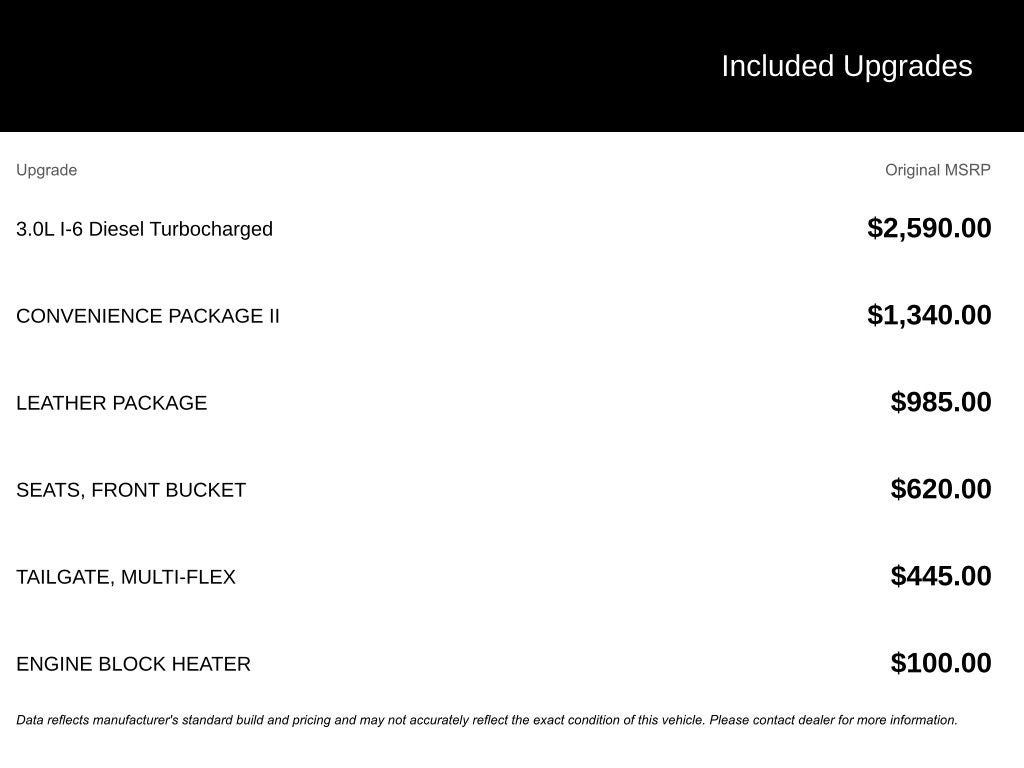 Convenience Package (10-Way Power Driver Seat w/Lumbar, 120-Volt Bed Mounted Power Outlet, 120-Volt Interior Power Outlet, Dual Rear USB Ports (Charge Only), Dual-Zone Automatic Climate Control, Electric Rear-Window Defogger, Heated Driver & Front Outboard Passenger Seats, Heated Steering Wheel, Keyless Open & Start, Remote Vehicle Starter System, Theft Deterrent System (Unauthorized Entry), and Wrapped Steering Wheel), Convenience Package II (Hitch Guidance w/Hitch View, In-Vehicle Trailering System App, Integrated Trailer Brake Controller, Power Sliding Rear Window w/Rear Defogger, Premium Bose 7-Speaker Sound System, and Universal Home Remote), Leather Package (Leather-Appointed Front Seat Trim), Preferred Equipment Group 2LT (12.3 Multicolor Reconfigurable Digital Display, 6-Speaker Audio System, All-Weather Floor Liner (LPO) (AAK), Auto-Locking Rear Differential, Bluetooth® For Phone, Chevrolet Connected Access Capable, Color-Keyed Carpeting Floor Covering, Deep-Tinted Glass, Electrical Steering Column Lock, Electronic Cruise Control, EZ Lift Power Lock & Release Tailgate, Front LED Fog Lamps, HD Rear Vision Camera, Heated Power-Adjustable Outside Mirrors, High Gloss Black Mirror Caps, Inside Rear-View Mirror w/Tilt, LED Cargo Area Lighting, OnStar & Chevrolet Connected Services Capable, Performance Red Recovery Hooks, Power Front Windows w/Driver Express Up/Down, Power Front Windows w/Passenger Express Down, Power Rear Windows w/Express Down, Rear 60/40 Folding Bench Seat (Folds Up), SiriusXM w/360L, Standard Tailgate, Steering Wheel Audio Controls, and Wi-Fi Hot Spot Capable), Suspension Package (Heavy-Duty Air Filter and Hill Descent Control), Trailering Package (Hitch Guidance), Up-Level Rear Seat w/Storage Package, 10-Speed Automatic, 4WD, Black Leather, 2 USB Data Ports, 220 Amp Alternator, 4-Wheel Disc Brakes, 40/20/40 Front Split-Bench Seat, 6 Speakers, ABS brakes, Air Conditioning, Alloy wheels, AM/FM radio: SiriusXM with 360L, Auto High-beam Headlights, Automatic Emergency Braking, Automatic temperature control, Brake assist, Cloth Seat Trim, Compass, Delay-off headlights, Driver door bin, Driver vanity mirror, Dual Exhaust w/Polished Outlets, Dual front impact airbags, Dual front side impact airbags, Electronic Stability Control, Electronic Transmission Range Selector Shifter, Engine Block Heater, Floor Mounted Center Console, Following Distance Indicator, Forward Collision Alert, Front anti-roll bar, Front Bucket Seats, Front Center Armrest w/Storage, Front dual zone A/C, Front fog lights, Front License Plate Kit, Front Pedestrian Braking, Front reading lights, Front wheel independent suspension, Fully automatic headlights, Heated door mirrors, Heated front seats, Heated steering wheel, Illuminated entry, IntelliBeam Automatic High Beam On/Off, Lane Keep Assist w/Lane Departure Warning, Low tire pressure warning, Multi-Flex Tailgate, Occupant sensing airbag, Outside temperature display, Overhead airbag, Overhead console, Panic alarm, Passenger door bin, Passenger vanity mirror, Power door mirrors, Power driver seat, Power steering, Power windows, Premium audio system: Chevrolet Infotainment 3 Premium, Radio data system, Radio: Chevrolet Infotainment 3 Premium System, Rear reading lights, Rear step bumper, Rear window defroster, Remote keyless entry, Security system, Single Outlet Exhaust, Speed control, Speed-sensing steering, Split folding rear seat, Steering wheel mounted audio controls, Tachometer, Telescoping steering wheel, Tilt steering wheel, Traction control, Trip computer, Variably intermittent wipers, Voltmeter, Wheels: 18 x 8.5 Black Painted Aluminum, and Wireless Charging.